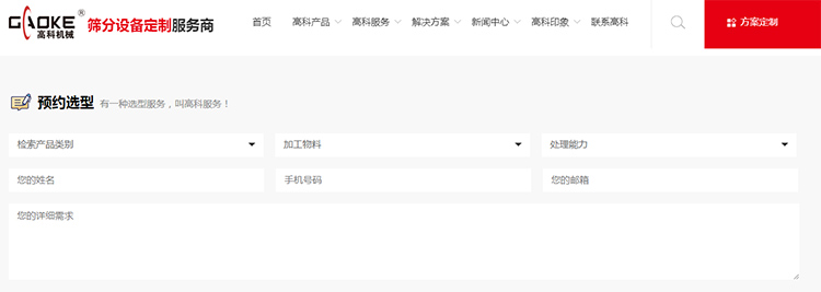 利用互聯(lián)網(wǎng)平臺(tái),高科機(jī)械還推出在線預(yù)約選型服務(wù),您只需要打開高科機(jī)械官網(wǎng),在高科服務(wù)一欄中找到預(yù)約選型服務(wù),即可在線填寫設(shè)備使用的產(chǎn)品類別、加工物料種類及處理能力等信息,留下聯(lián)系方式后,我們的工作人員會(huì)在兩個(gè)工作日內(nèi)回復(fù),為您提供科學(xué)合理的選型方案。